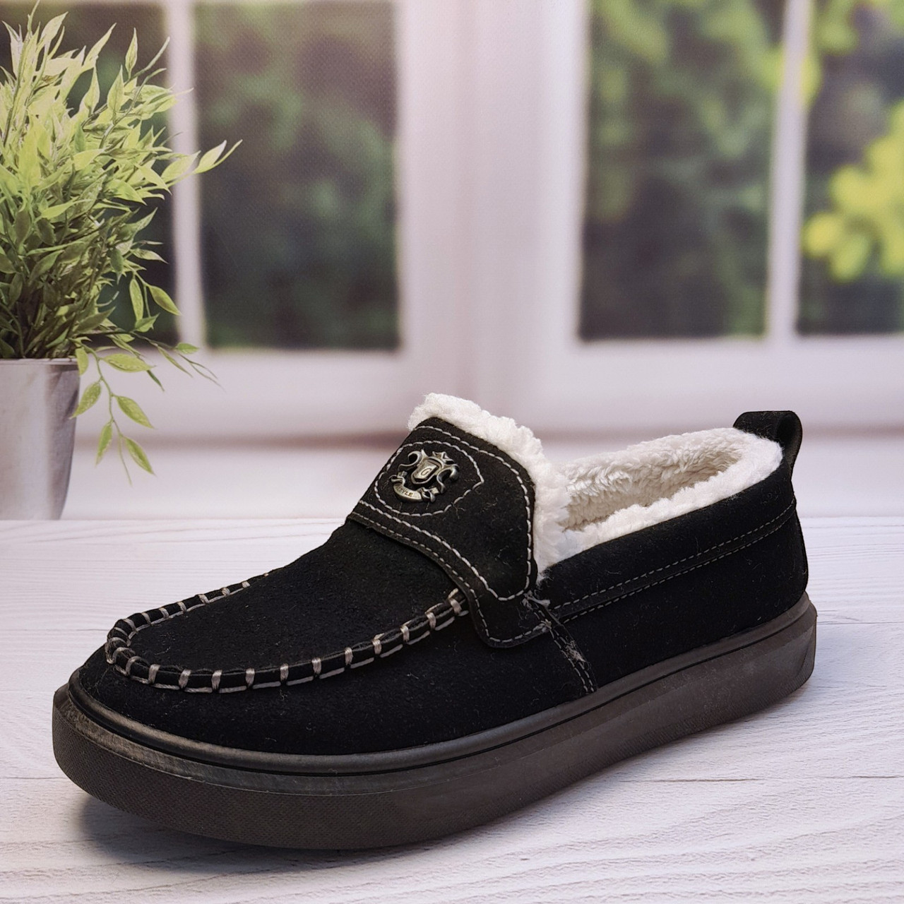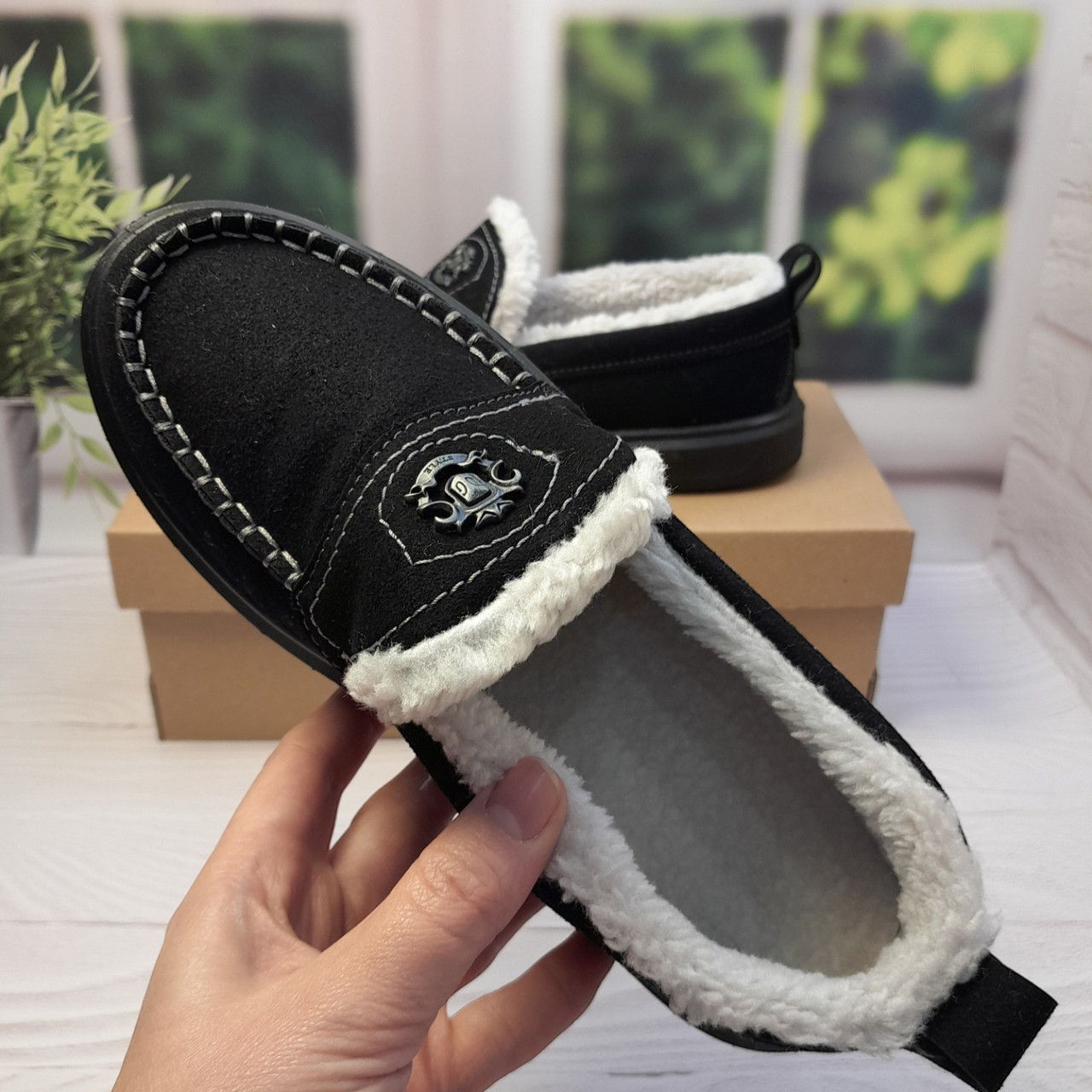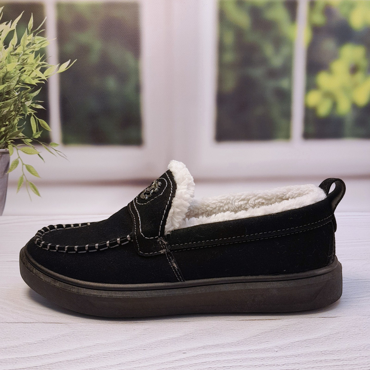 Верх виконаний із щільної еко-замші, яка добре тримає форму та легко очищується. Усередині — густе штучне хутро з коротким ворсом, яке забезпечує рівномірне тепло по всій внутрішній частині взуття.