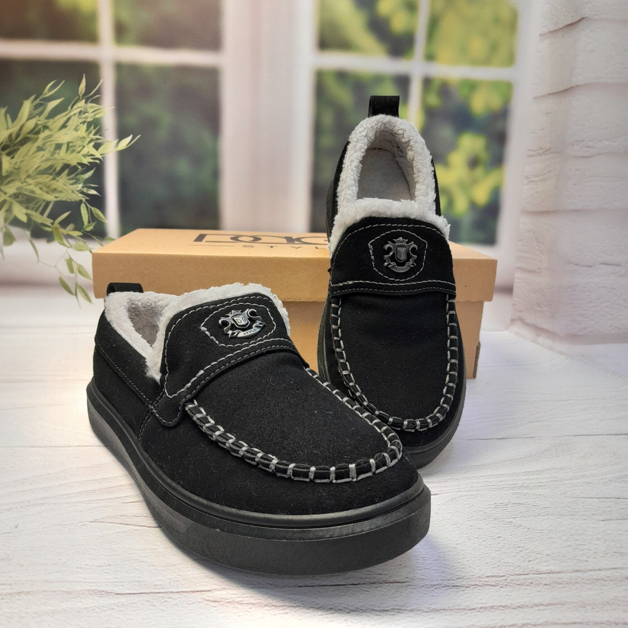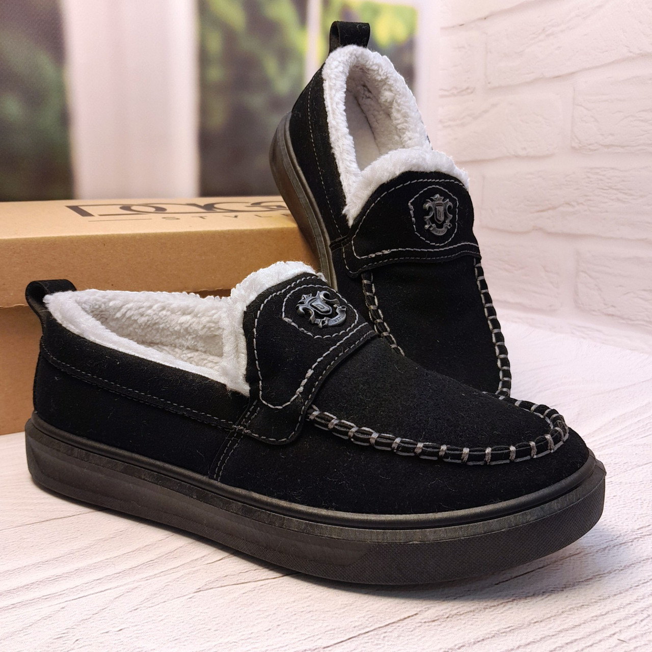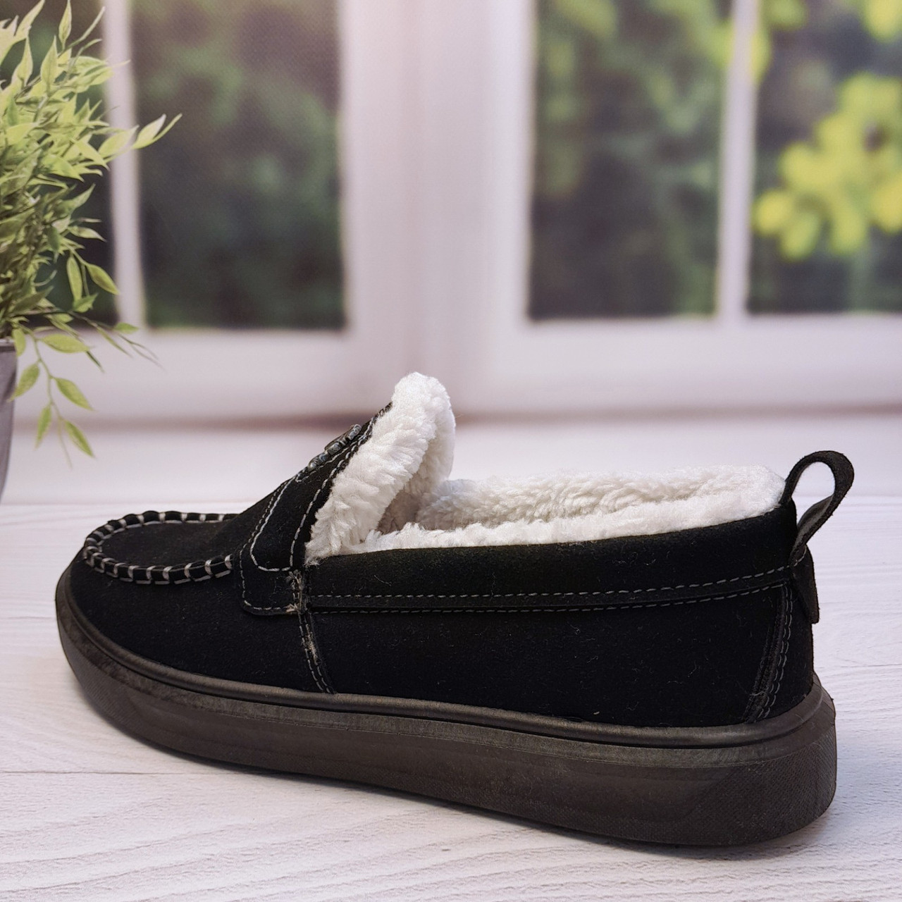 Верх виконаний із щільної еко-замші, яка добре тримає форму та легко очищується. Усередині — густе штучне хутро з коротким ворсом, яке забезпечує рівномірне тепло по всій внутрішній частині взуття.