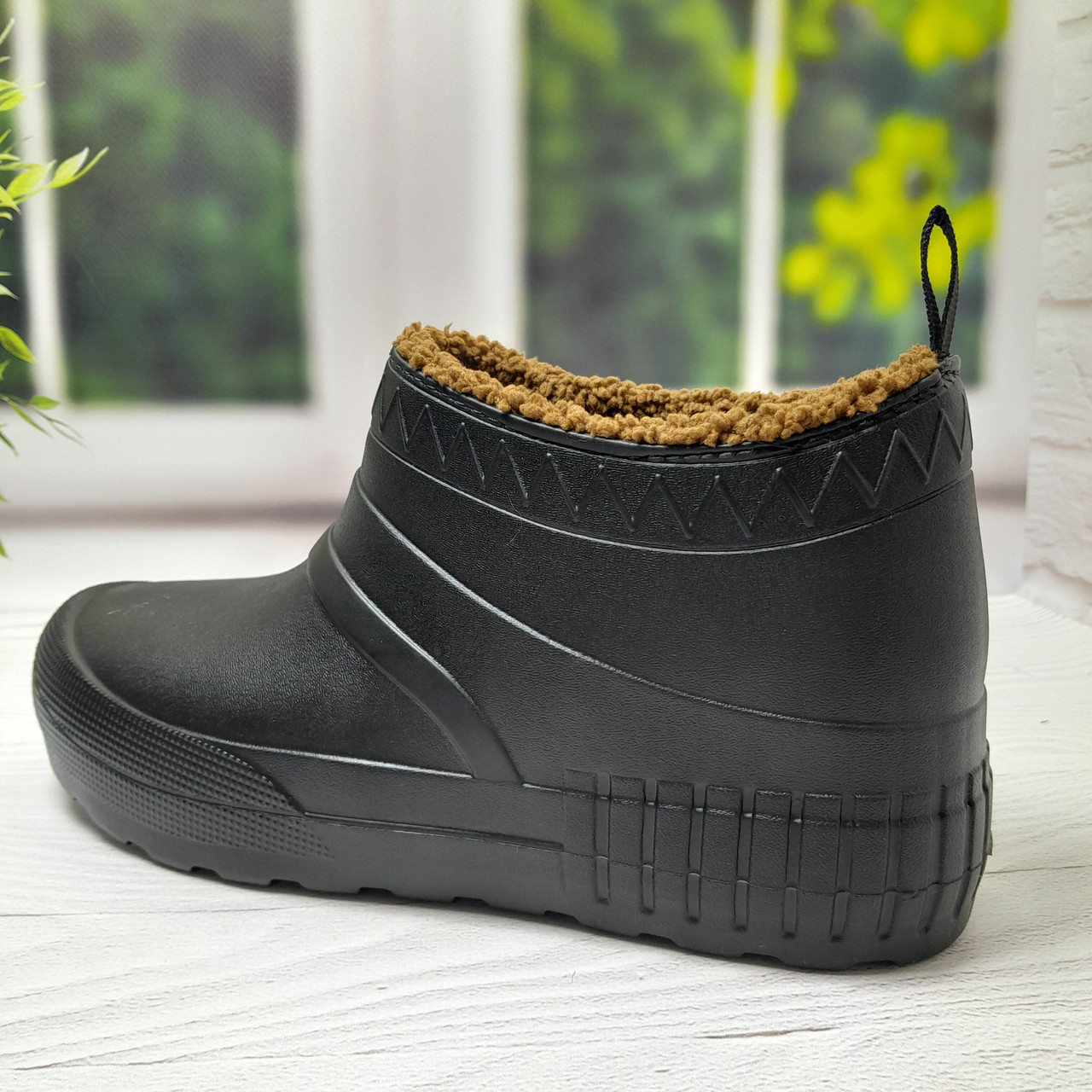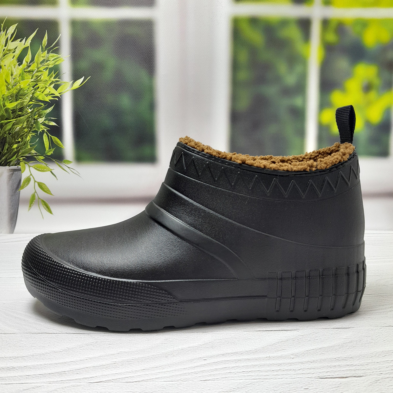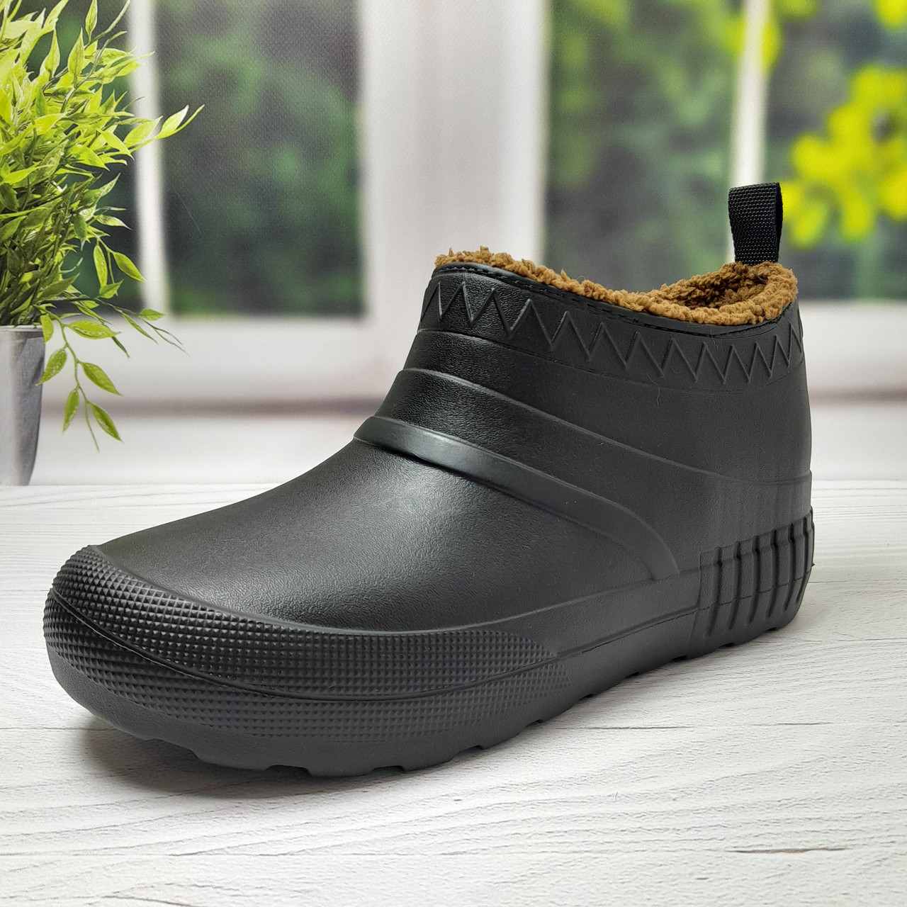 Модель виготовлена з легкого та міцного матеріалу ЕВА-піни, який не пропускає вологу і не втрачає форму. Внутрішня частина утеплена м'яким штучним хутром високої якості, що гарантує оптимальний теплообмін і затишок навіть у сильні морози. Хутро не линяє.